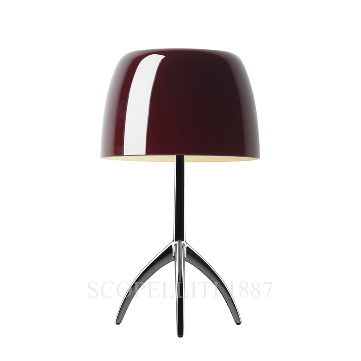 Caratteristiche tecniche Dimensioni: L. 26 cm - P. 26 cm - H. 45 cm Sorgente luminosa: Halo o LED Retrofit 2×48W G9. Potenza minima della lampadina 40W. Materiali: vetro soffiato e alluminio verniciato. Finiture: base cromo nero e paralume ciliegia.