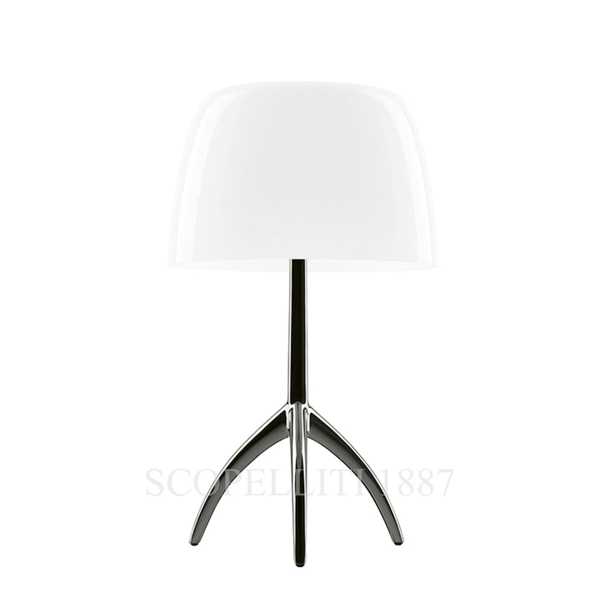 Caratteristiche tecniche Dimensioni: L. 20 cm - P. 20 cm - H. 35 cm Sorgente luminosa: Halo o LED Retrofit 1×42W G9. Materiali: vetro soffiato e alluminio verniciato. Finiture: base in cromo nero e paralume bianco caldo