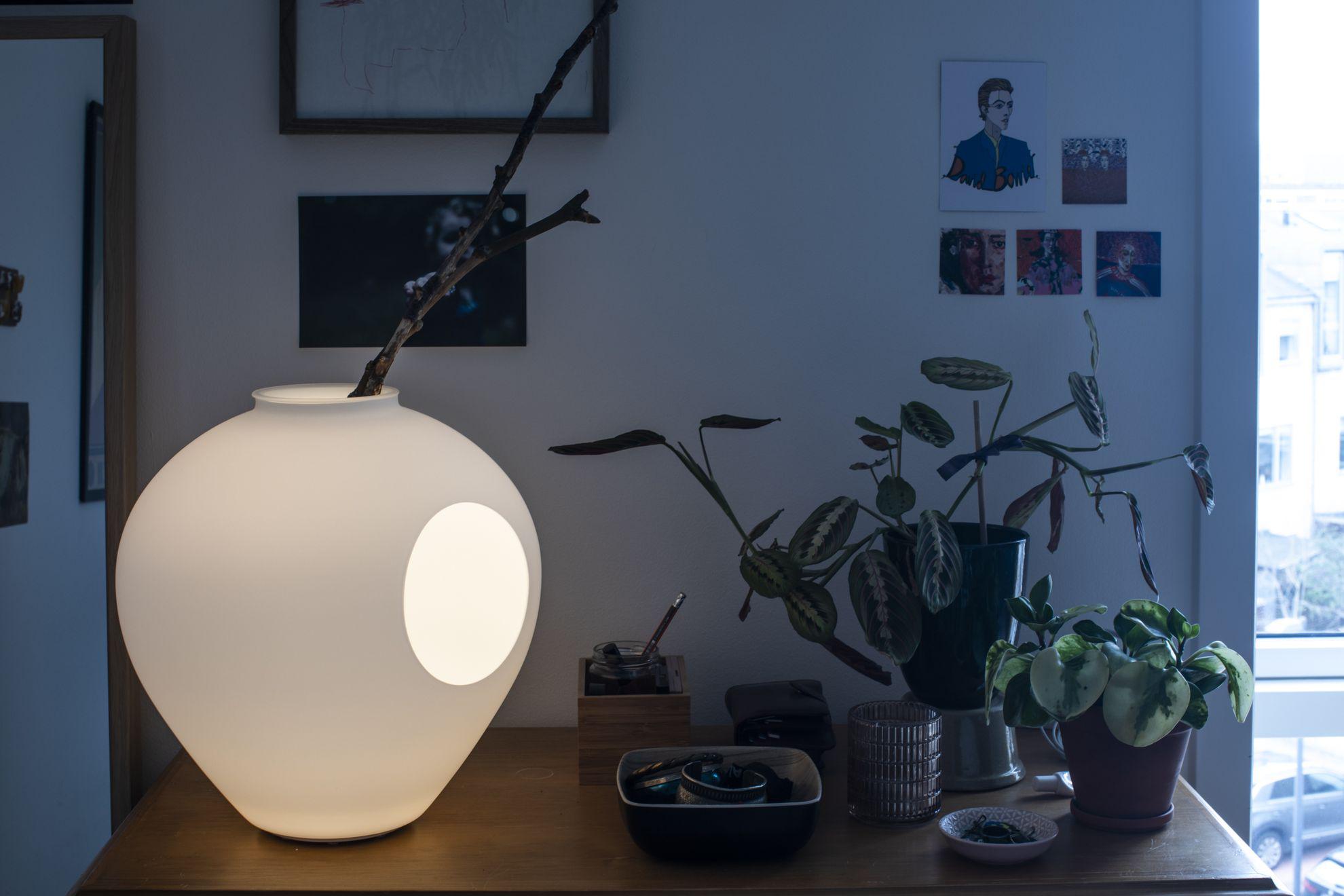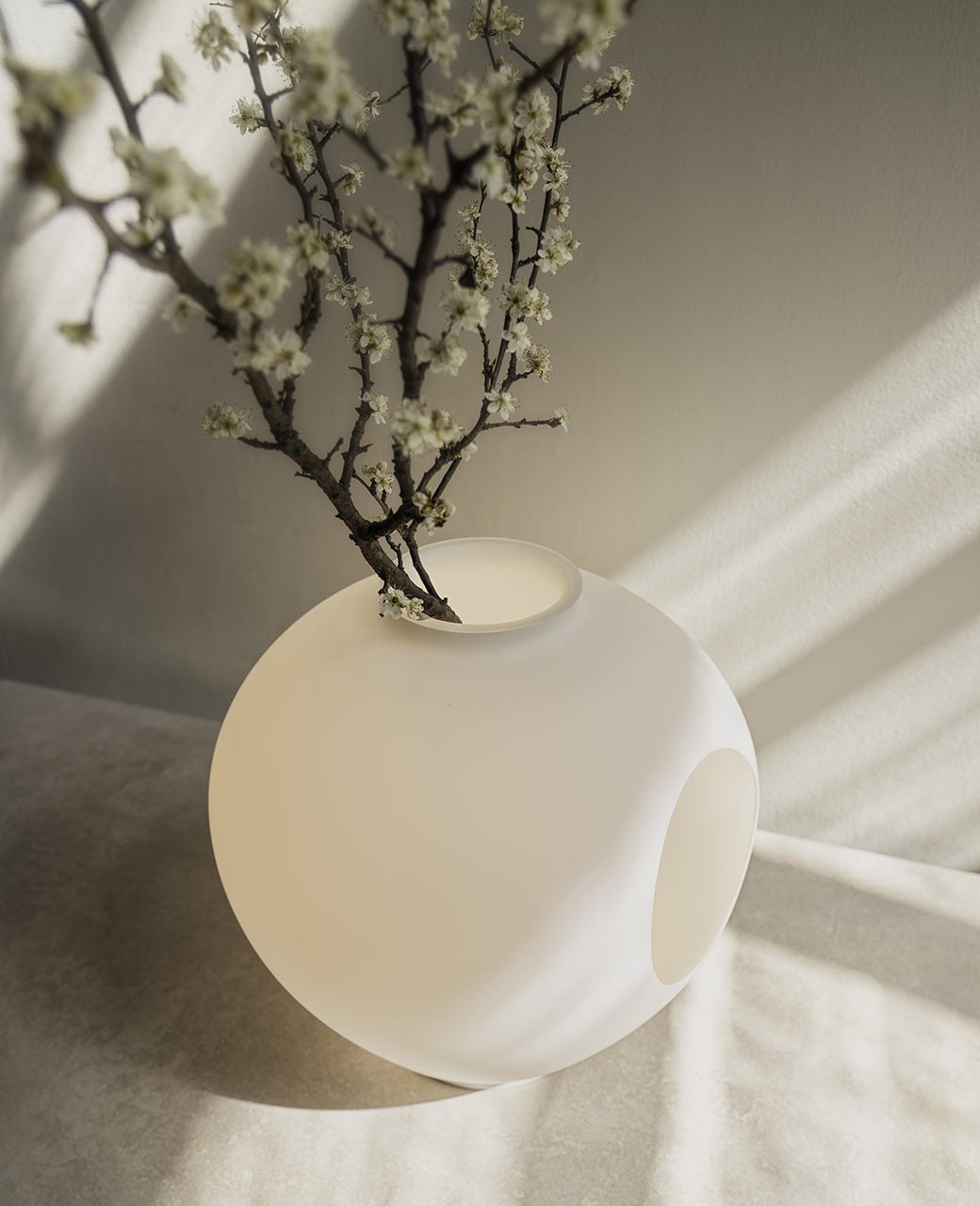 Madre è un oggetto dal contenuto poetico, pieno di riferimenti. Qui si esplora ogni aspetto della luce come elemento generatore di vita: miti, statuette, il movimento dei corpi celesti, l'alternarsi del giorno e della notte.La cavità superiore del grande corpo luminoso di Madre contiene un vaso in vetro borosilicato smerigliato, in cui collocare dei rami per creare una composizione elegante.L'apertura - che sembra interrompere il vaso proprio al centro - crea profondità, facendo riflettere la luce anche a lampada spenta. C'è qualcosa di magico: l'apertura è un punto di confine e di scambio tra luce interna ed esterna, unite in un'unica immagine.