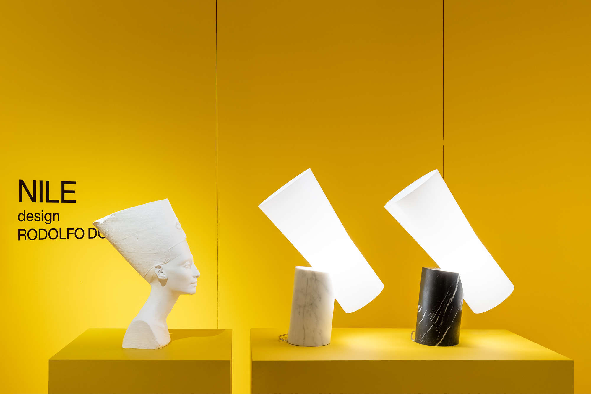 Ideata da Rodolfo Dordoni, Nile è una lampada da tavolo di grande carattere, con una presenza scenica importante, in grado di trasferire ad ogni ambiente la propria eleganza sofisticata. Un oggetto che rappresenta il perfetto equilibrio tra due opposti, la consistenza del marmo e la delicatezza del vetro, tra il freddo di un materiale estratto e il calore di un materiale soffiato. Lampada da tavolo con luce diffusa e diretta verso il basso e verso l’alto. Diffusore in vetro incamiciato bianco soffiato a bocca. Base in marmo lucidato con finitura opaca, lavorato a mano, di Carrara nella versione bianco e di Marquina in versione nero. La superficie inferiore della base è protetta da un disco salva-graffio in gomma. Cavo in tessuto intrecciato grigio e bianco, spina trasparente e dimmer.