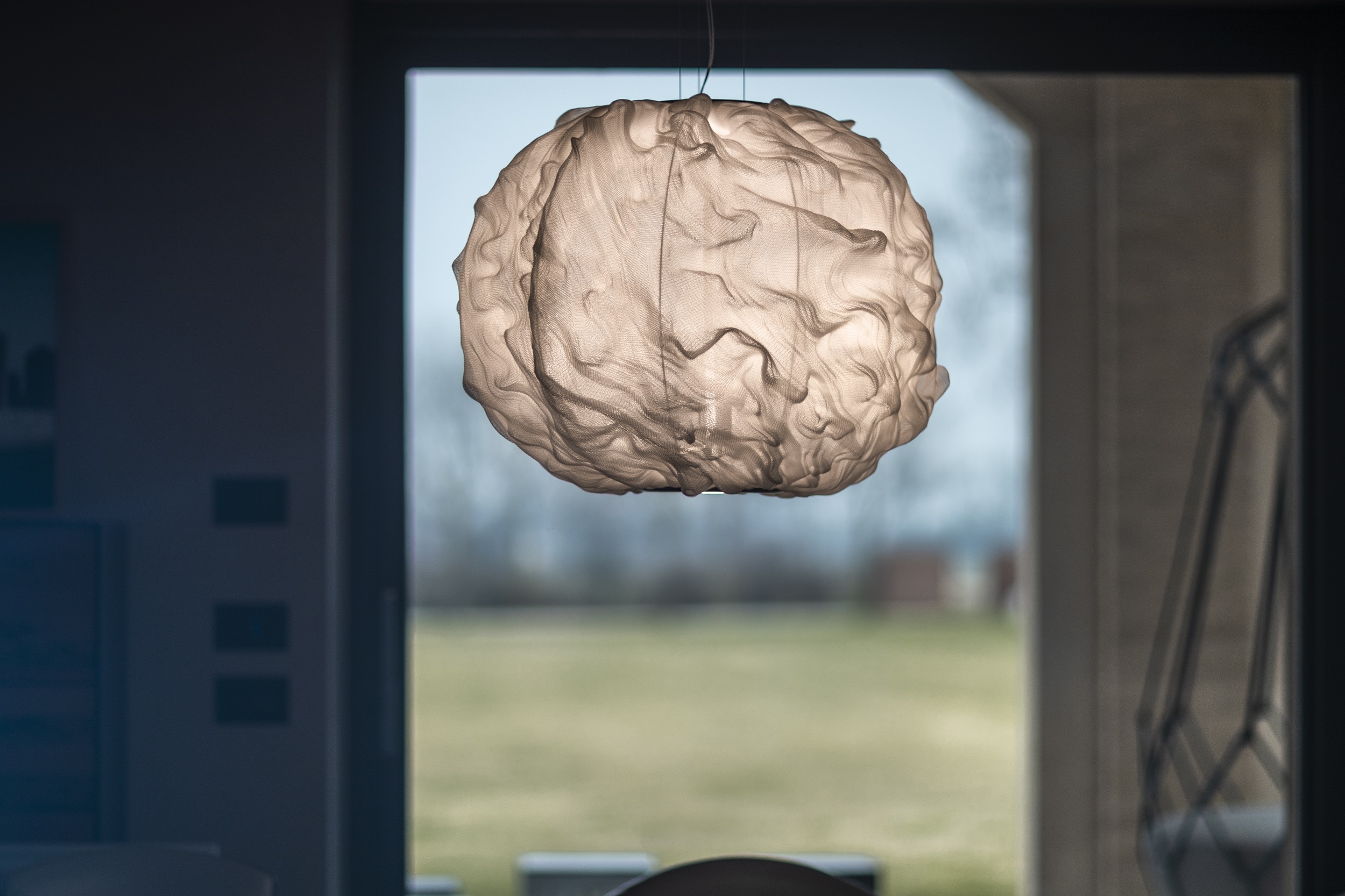 La lampada Nuée è caratterizzata da un particolare tessuto tecnico tridimensionale (PBTBianco) che può essere tirato per modellarne a piacimento la forma, creare composizioni sempre nuove, rendendo così la tua lampada un pezzo unico ed originale.