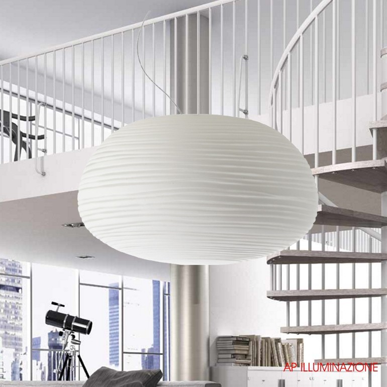 Caratteristiche tecniche Dimensioni Ø 34 cm - H. 19 cm Sorgente luminosa: LED retrofi t o Fluo 1×15W o Halo 1×70W E27 Materiali: diffusore in vetro satinato; ghiera in policarbonato trasparente; cavo in acciaio inox; rosone a soffitto con staffa in metallo zincato e copertura in ABS. Finiture: diffusore bianco satinato; cavo elettrico trasparente; rosone bianco opaco.