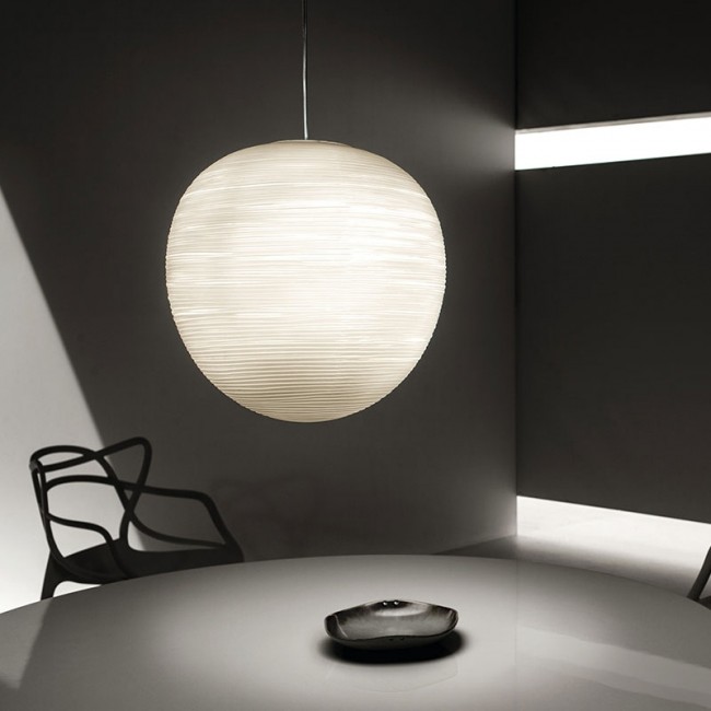 Rituals XL Sospensione è una lampada in vetro disegnate da Ludovica+Roberto Palomba per Foscarini. Versione LED Dimmerabile. L'effetto rigato del vetro soffiato caratterizza questa collezione di lampade dal design sinuoso e avvolgente. L'effetto gessoso, ricavato da un processo manuale, valorizza la particolare texture di Rituals amplificando il risultato estremamente elegante.