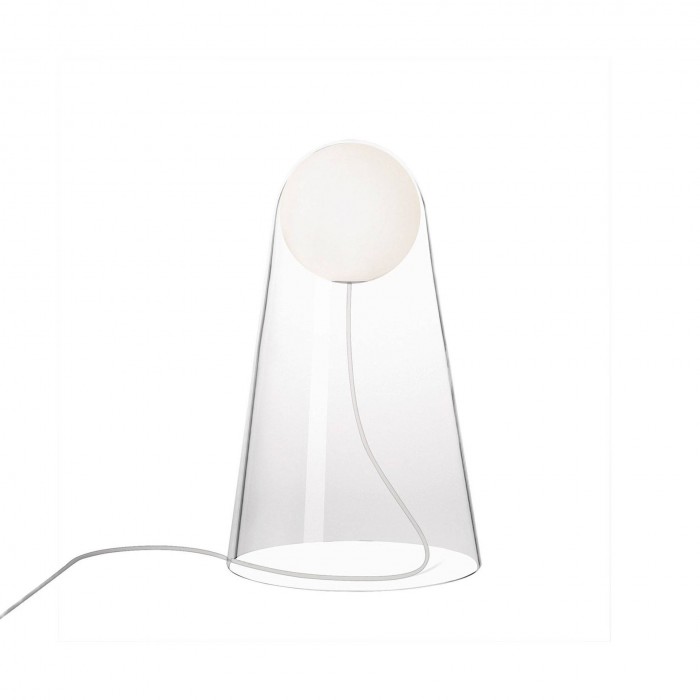 Caratteristiche tecniche Dimensioni: Ø 24 cm - H. 39 cm Sorgente luminosa: 1 x 8W E27 LED retrofit, 3000K, incluso nel prezzo. Dimmerabile. Materiali: Vetro soffiato. Finiture: bianco e trasparente.