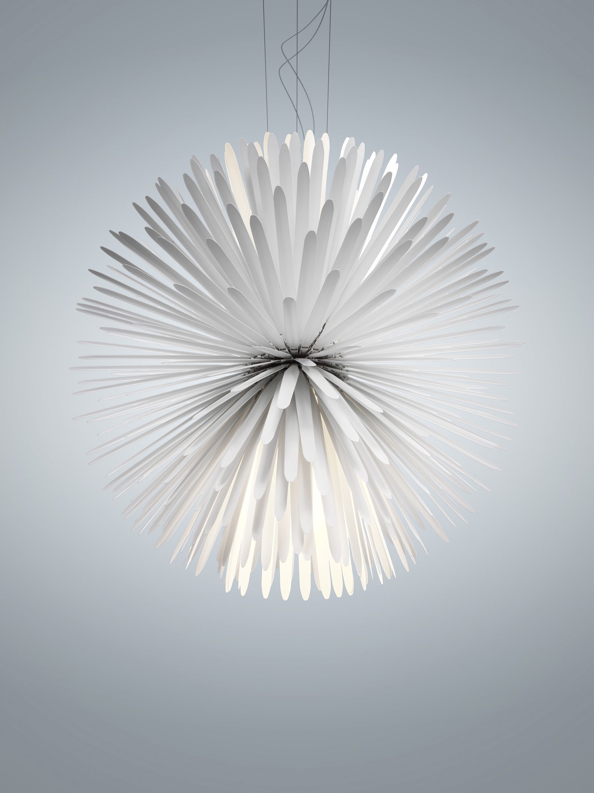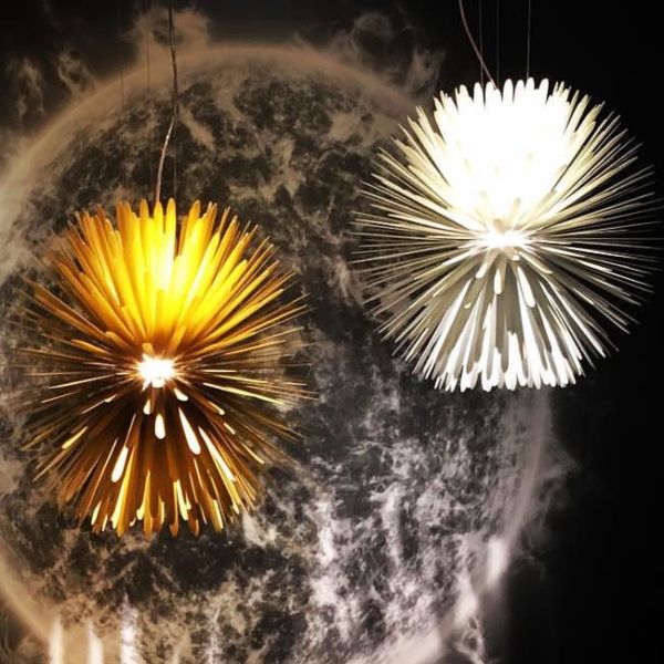 Lampada a sospensione Sun Light Of Love si caratterizza per il design che confonde i contorni, ridefinisce il concetto di dentro e fuori proprio come fa la luce del sole. La lampada si compone di 390 raggi disposti per schermare e riflettere la luce a LED del nucleo centrale, fornendo una luce morbida e diffusa. Disponibile in due colori bianco e oro.