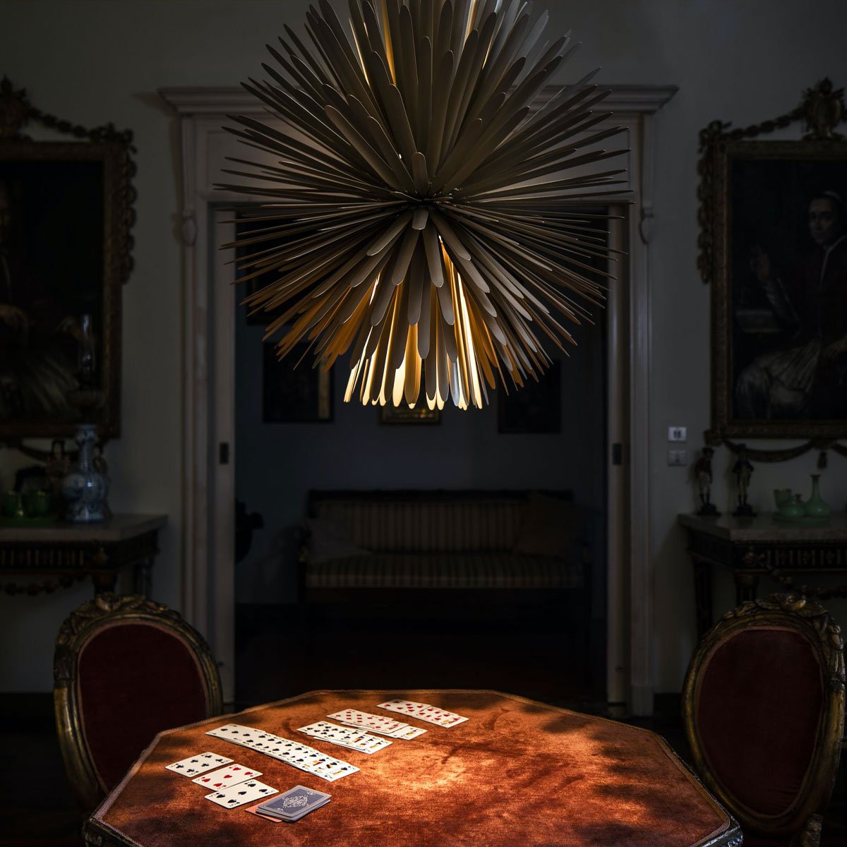 Lampada a sospensione Sun Light Of Love si caratterizza per il design che confonde i contorni, ridefinisce il concetto di dentro e fuori proprio come fa la luce del sole. La lampada si compone di 390 raggi disposti per schermare e riflettere la luce a LED del nucleo centrale, fornendo una luce morbida e diffusa. Disponibile in due colori bianco e oro.