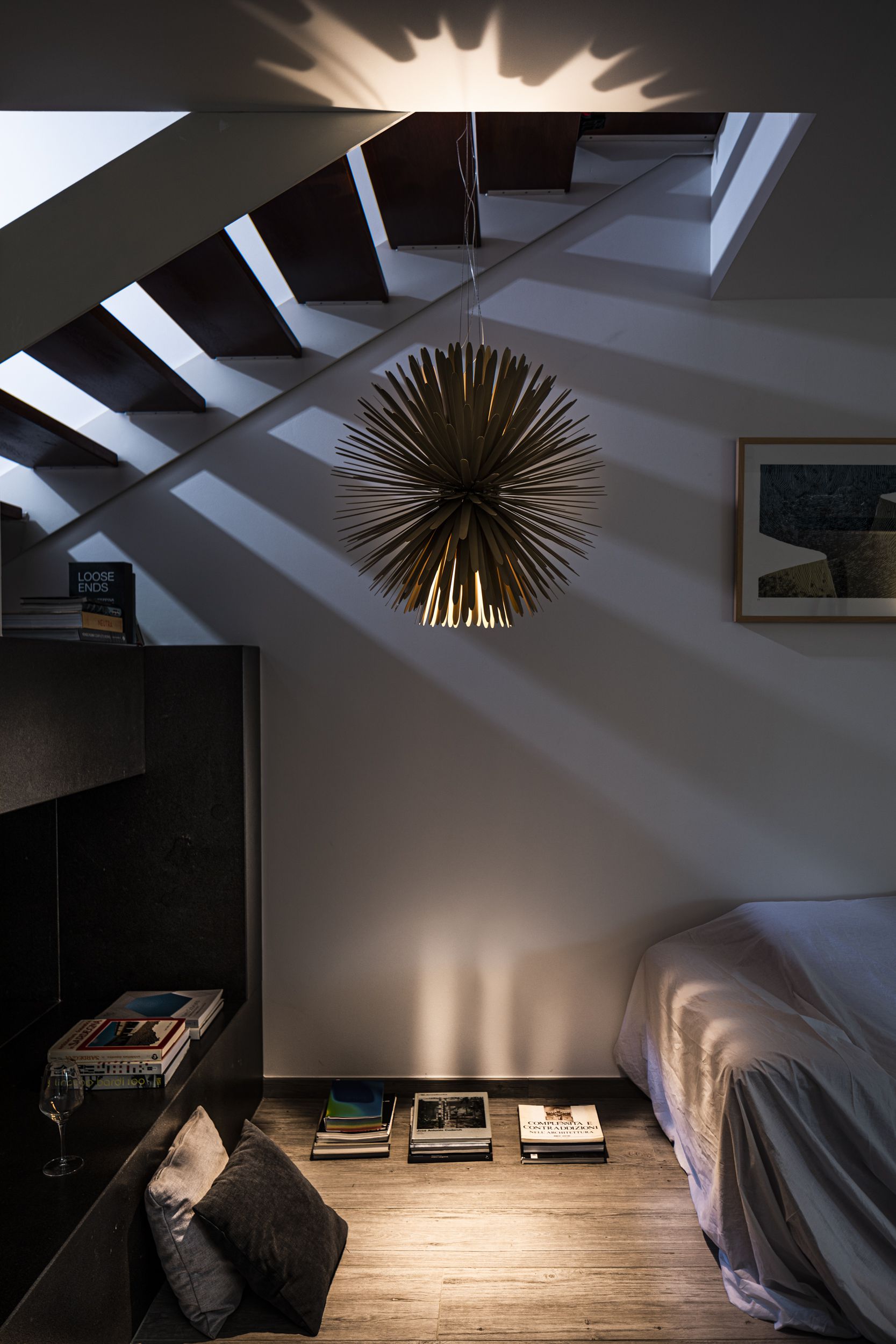 Lampada a sospensione Sun Light Of Love si caratterizza per il design che confonde i contorni, ridefinisce il concetto di dentro e fuori proprio come fa la luce del sole. La lampada si compone di 390 raggi disposti per schermare e riflettere la luce a LED del nucleo centrale, fornendo una luce morbida e diffusa. Disponibile in due colori bianco e oro.