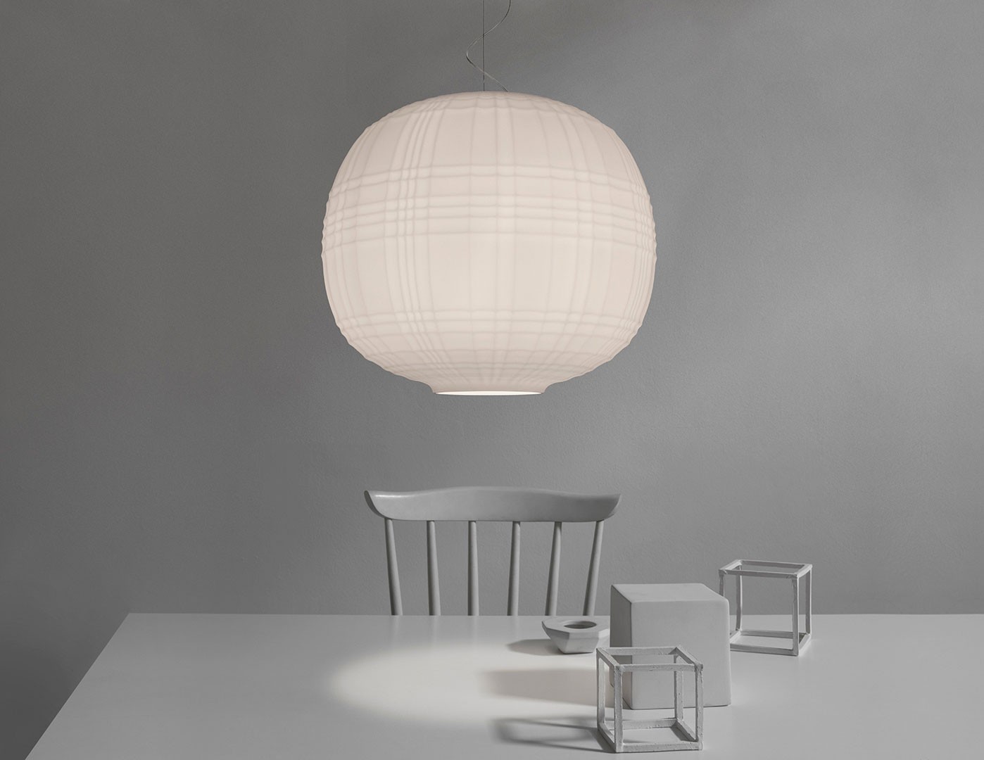 Realizzata con la tecnica della soffiatura a bocca in uno stampo, Tartan di Foscarini si presenta al pubblico con un particolare incrocio di linee perpendicolari che ricorda il motivo geometrico del kilt. L'acidatura della superficie contribuisce inoltre a conferire al progetto una morbidezza materica visiva e tattile.