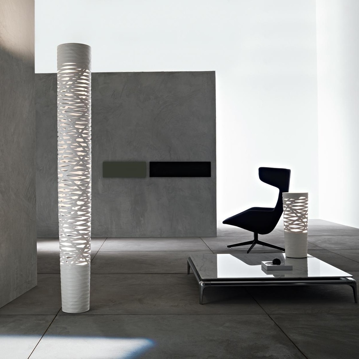 Tress Grande Lampada da Terra è disponibile in diversi colori. A seconda della finitura Tress assume un fascino diverso: leggera e discreta in bianco, forte e decisa in nero, contemporanea e versatile in greige. Ad assicurare un risultato sempre unico ci pensa il dinamico gioco di luci e ombre creato dal decoro.