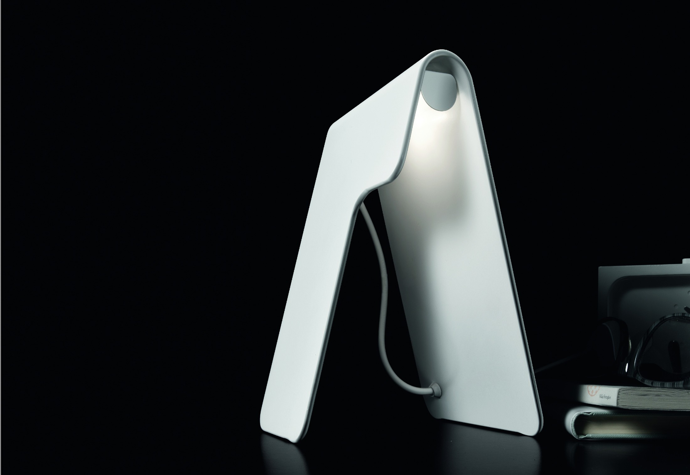 Una lampada da tavolo in un solo colore, bianco, sfidando i limiti dimensionali e rivelando la sua forte personalità. La fonte luminosa è nascosta nel componente curvo, caratterizzato da un taglio sottile che aggiunge l'eleganza estetica della lampada. Quando è acceso, la luce crea un'atmosfera di confortevole intimità.