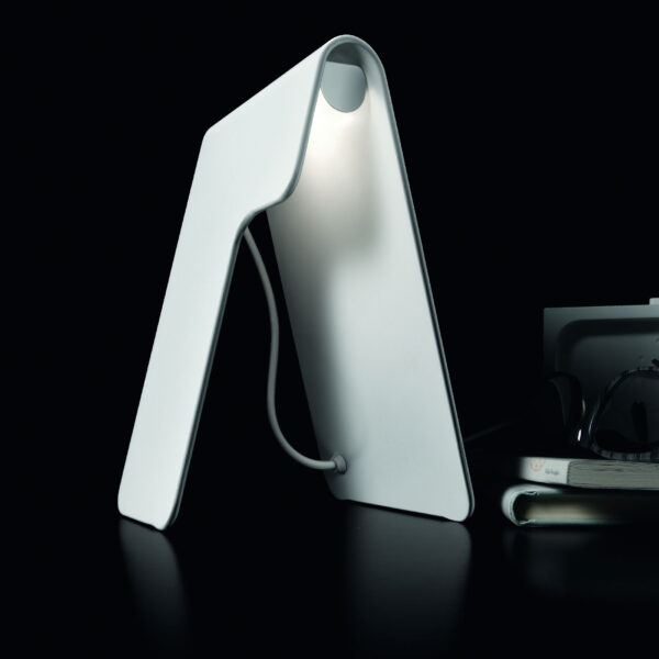 Una lampada da tavolo in un solo colore, bianco, sfidando i limiti dimensionali e rivelando la sua forte personalità. La fonte luminosa è nascosta nel componente curvo, caratterizzato da un taglio sottile che aggiunge l'eleganza estetica della lampada. Quando è acceso, la luce crea un'atmosfera di confortevole intimità.