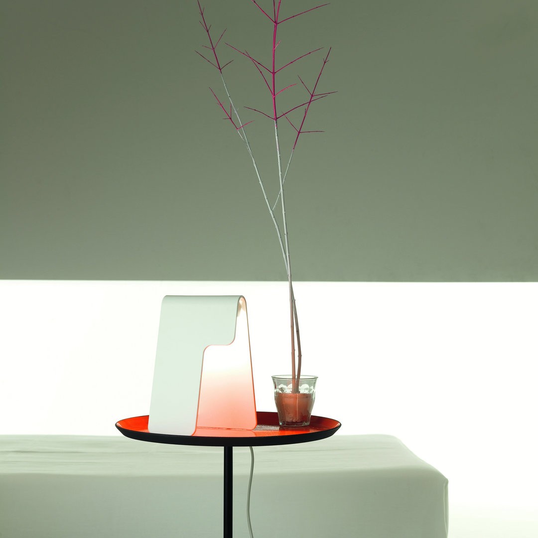 Una lampada da tavolo in un solo colore, bianco, sfidando i limiti dimensionali e rivelando la sua forte personalità. La fonte luminosa è nascosta nel componente curvo, caratterizzato da un taglio sottile che aggiunge l'eleganza estetica della lampada. Quando è acceso, la luce crea un'atmosfera di confortevole intimità.