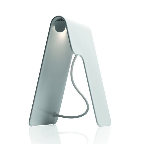 Una lampada da tavolo in un solo colore, bianco, sfidando i limiti dimensionali e rivelando la sua forte personalità. La fonte luminosa è nascosta nel componente curvo, caratterizzato da un taglio sottile che aggiunge l'eleganza estetica della lampada. Quando è acceso, la luce crea un'atmosfera di confortevole intimità.