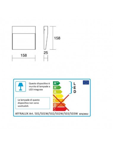 Installazione A parete Ambiente Per interni, per esterno Finitura Sabbiata Peso 0,43 kg Fonti luminose disponibili 501 - 502 - 503 501W - 502W - 503W LED SMD LED SMD EPISTAR EPISTAR 4000°k 527lm 3000°k 527lm CRI 80 ra CRI 80 ra Tensione 220-240V Potenza 6W Materiali principali Alluminio, PMMA Conformità Classe di isolamento 1