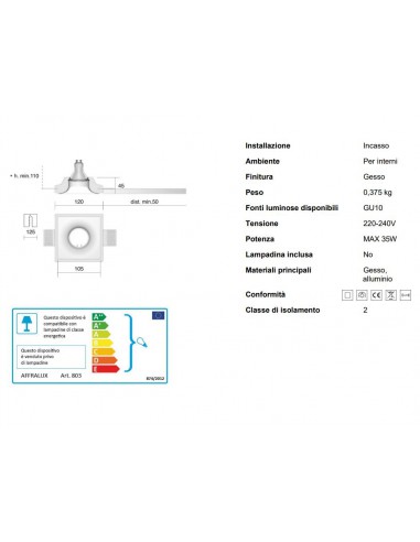 Installazione Incasso Ambiente Per interni Finitura Gesso Peso 0,375 kg Fonti luminose disponibili GU10 Tensione 220-240V Potenza MAX 35W Lampadina inclusa No Materiali principali Gesso, alluminio Conformità Classe di isolamento 2