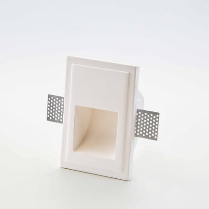 Segnapasso quadrato in gesso, montaggio incasso a scomparsa con staffe incorporate in alluminio per cartongesso da 9 a 18 mm o laterizio.