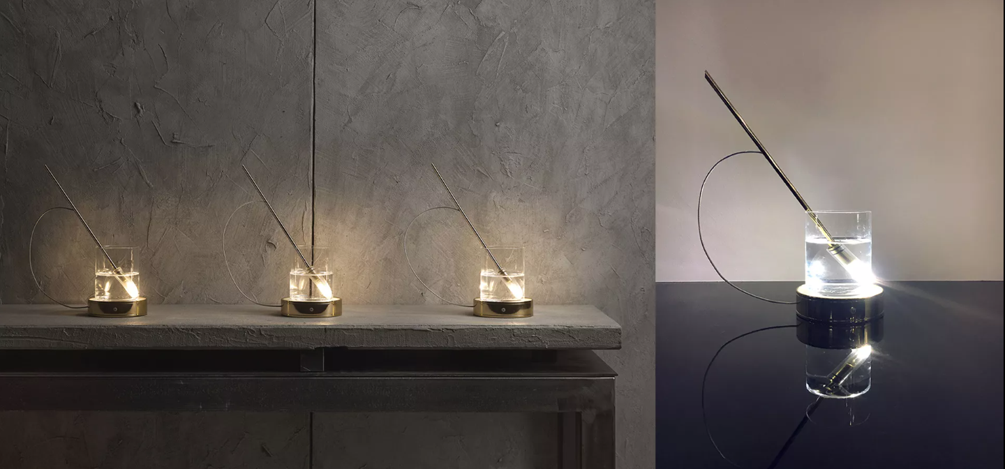 “Sei Fuori!” È una collezione adatta per sia per l’illuminazione outdoor che indoor. Le versioni da parete, da tavolo e da terra con la loro luce immersa nell’acqua creano in questo modo un gioco di luce eterea e avvolgente adatto ad ogni ambiente.