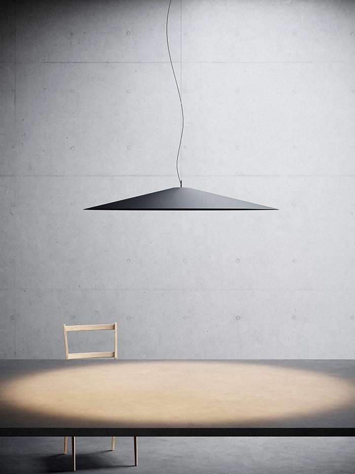 Eleganza e purezza formale caratterizzano questa famiglia di lampade a sospensione battezzata Koine?, sia per riferimento allo studio Mandalaki (traduzione greca del termine “molletta”), che per il suo significato: “lingua comune”, proprio per la sua geometria che le conferisce un’estrema versatilita?. Il vero cuore progetto non e? tuttavia il design del prodotto, ma il motore luminoso che lo anima. E’ qui che risiede la grande portata innovativa di Koine?. Alla sorgente luminosa e? stata infatti applicata una lente minerale, appositamente progettata. Il fascio luminoso distribuito dalla lente risulta omogeneo e pulito, un cono di luce ampio e al contempo dai contorni netti. Il confine tra luce e ombra risulta cosi? nitido e non sfumato. Grazie all’attento orientamento della luce, Koine? e? priva di abbagliamento, garantendo cosi? un totale comfort luminoso. Il riflettore e? un cappello che riveste principalmente un ruolo decorativo. Koine? e? disponibile in tre dimensioni (37, 55 e 110 cm di diametro) e l’ingombro in altezza risulta sempre limitato. I colori disponibili sono nero, bianco e alluminio. La geometria del rosone riprende quella del diffusore.