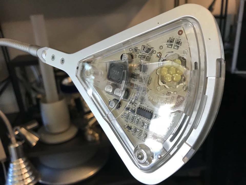 Una serie di diodi multicolore fornisce una luce intensa, calda e piacevole a bassissim consumi (solo 5W). Mix garantisce una durata media della sorgente luminosa di circa 50.000 ore (contro 2.000 ore di una normale lampadina alogena). Quando è spenta, il suo profilo si illumina di una luce blu che permette di individuare la lampada anche al buio.