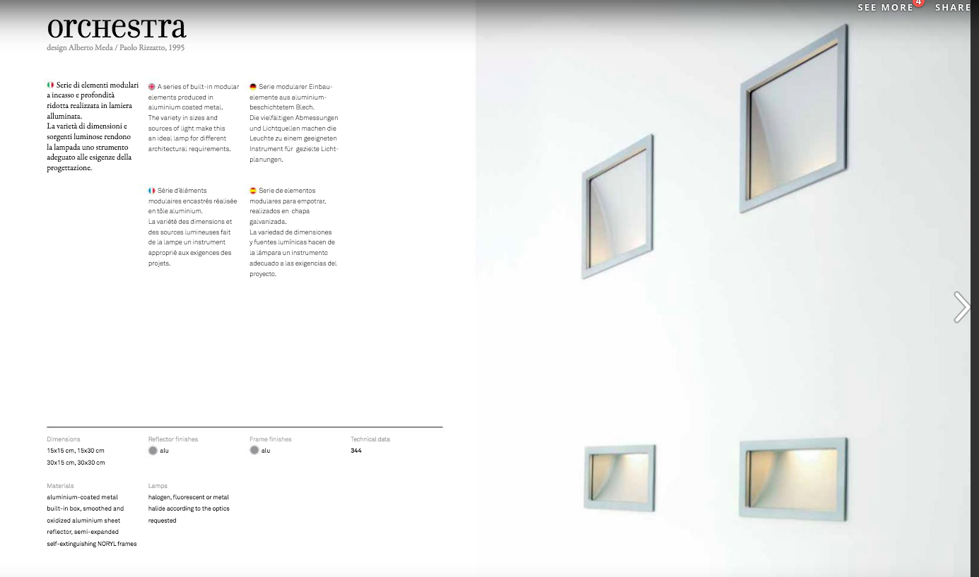 Serie di elementi modulari a incasso e profondità ridotta realizzata in lamiera alluminata. La varietà di dimensioni e sorgenti luminose rendono la lampada uno strumento adeguato alle esigenze della progettazione