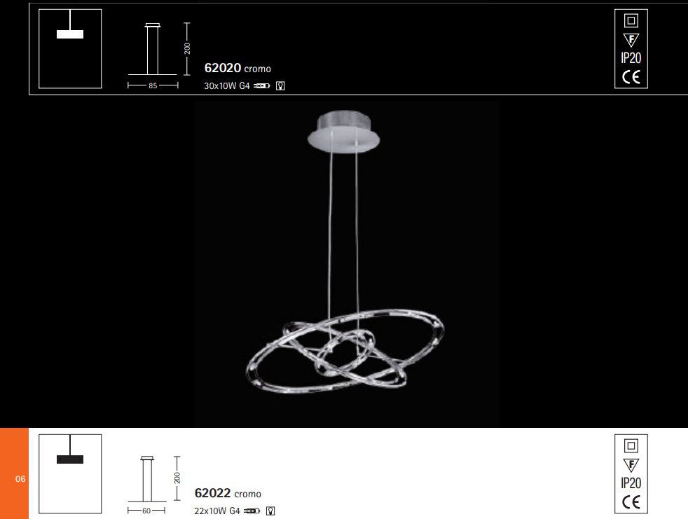 Serie in bassa tensione. Struttura in metallo cromato con apertura dei cerchi graduabile. Cavo a lunghezza regolabile.