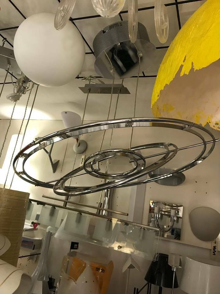 Serie in bassa tensione. Struttura in metallo cromato con apertura dei cerchi graduabile. Cavo a lunghezza regolabile.