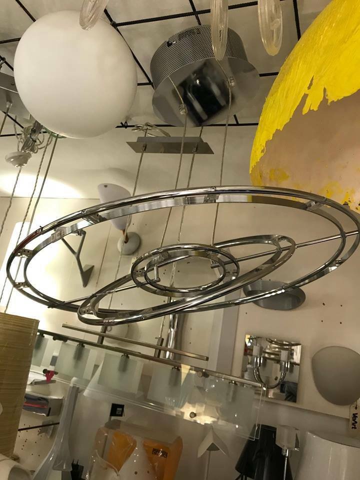 Serie in bassa tensione. Struttura in metallo cromato con apertura dei cerchi graduabile. Cavo a lunghezza regolabile.