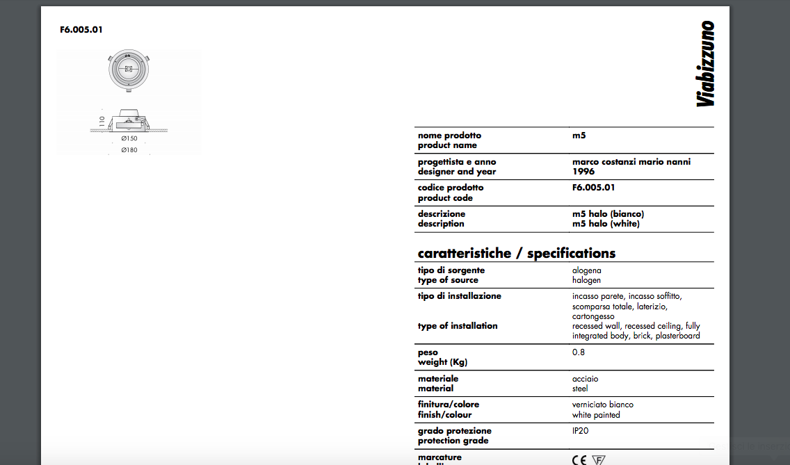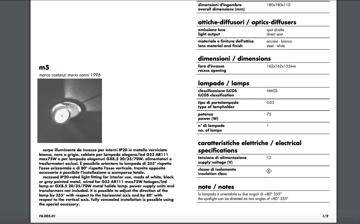 Viabizzuno M5 bianco F6.005.01 G53 75W Corpo A Incasso
