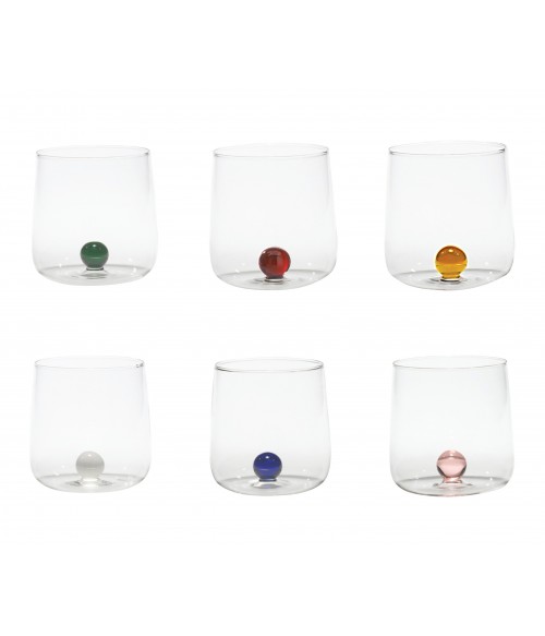 Bicchieri e bottiglie in vetro colorato borosilicato fatti a mano e resistenti agli shock termici. Proposti in diverse varianti colore riferite alla sfera interna, questa collezione nasce dal ricordo delle giornate in spiaggia, chinati a giocare sulla riva, impegnati a "tener in pista" le bilie di vetro colorato.