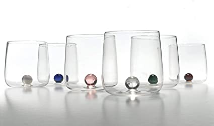 Bicchieri e bottiglie in vetro colorato borosilicato fatti a mano e resistenti agli shock termici. Proposti in diverse varianti colore riferite alla sfera interna, questa collezione nasce dal ricordo delle giornate in spiaggia, chinati a giocare sulla riva, impegnati a "tener in pista" le bilie di vetro colorato.